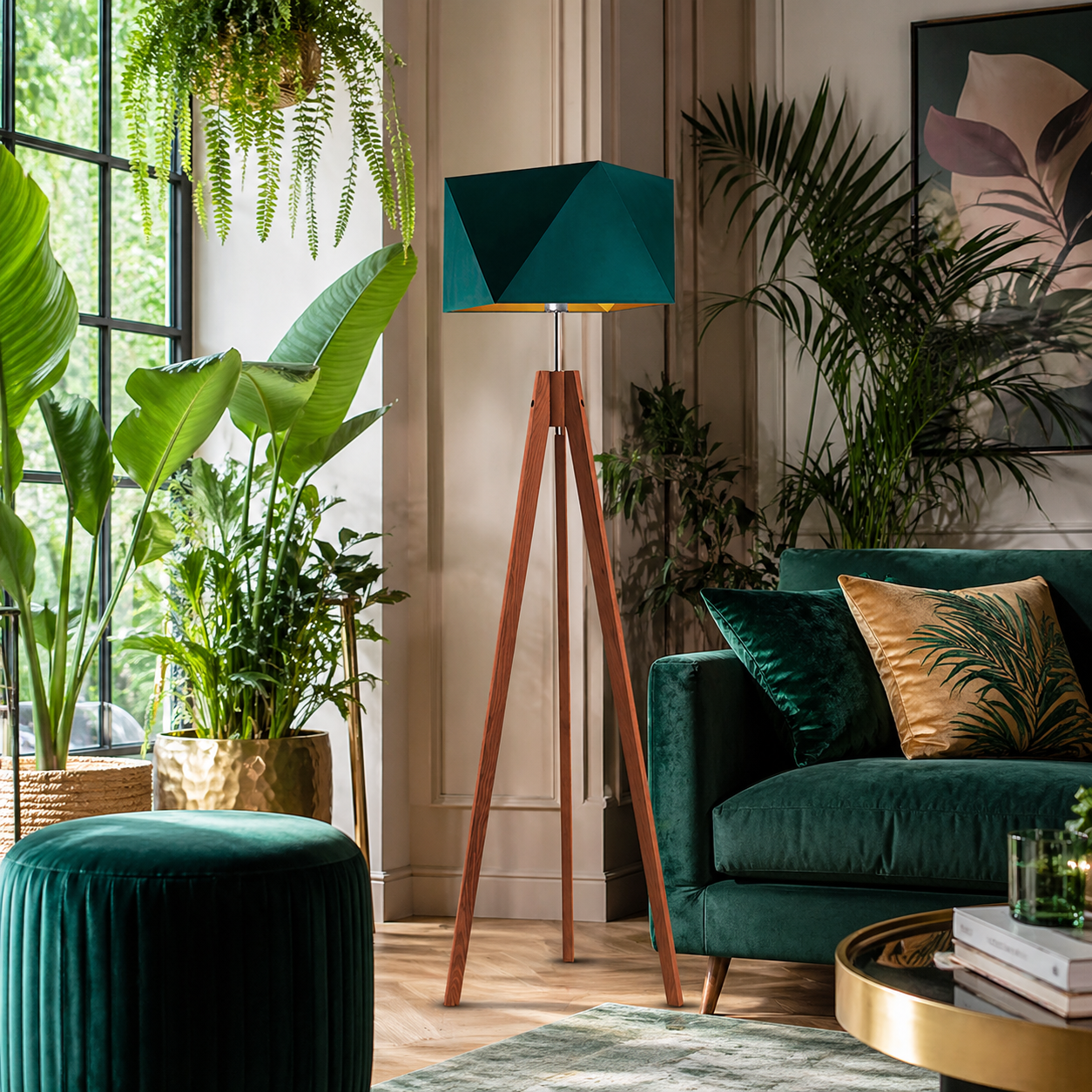 Drewniana lampa stojąca do sypialni LAGOS GOLD to nowoczesne oświetlenie, które efektownie ozdobi i rozpromieni Twoje wnętrze. Ta stylowa lampa podłogowa drewniana na trójnogu o wysokości 144 cm, wyposażona w diamentowy abażur o przekątnej 45 cm, została zaprojektowana z myślą o przestrzeniach wypoczynkowych, takich jak sypialnia czy salon.