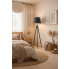 Abażur w kształcie stożka wykonany został z holenderskiej tkaniny tekstylnej podklejonej na białej lub bezbarwnej folii PVC (w przypadku koloru betonowego), natomiast stelaż to naturalne drewno sosnowe. Niezaprzeczalną zaletą tej lampy stojącej z drewna jest wybór koloru abażuru spośród kilkunastu wariantów kolorystycznych oraz 5 kolorów drewna (białego, popielatego, dębowego, mahoniowego oraz hebanowego). Lampę stojącą na trójnogu docenią miłośnicy prostych form i oszczędnego stylu.