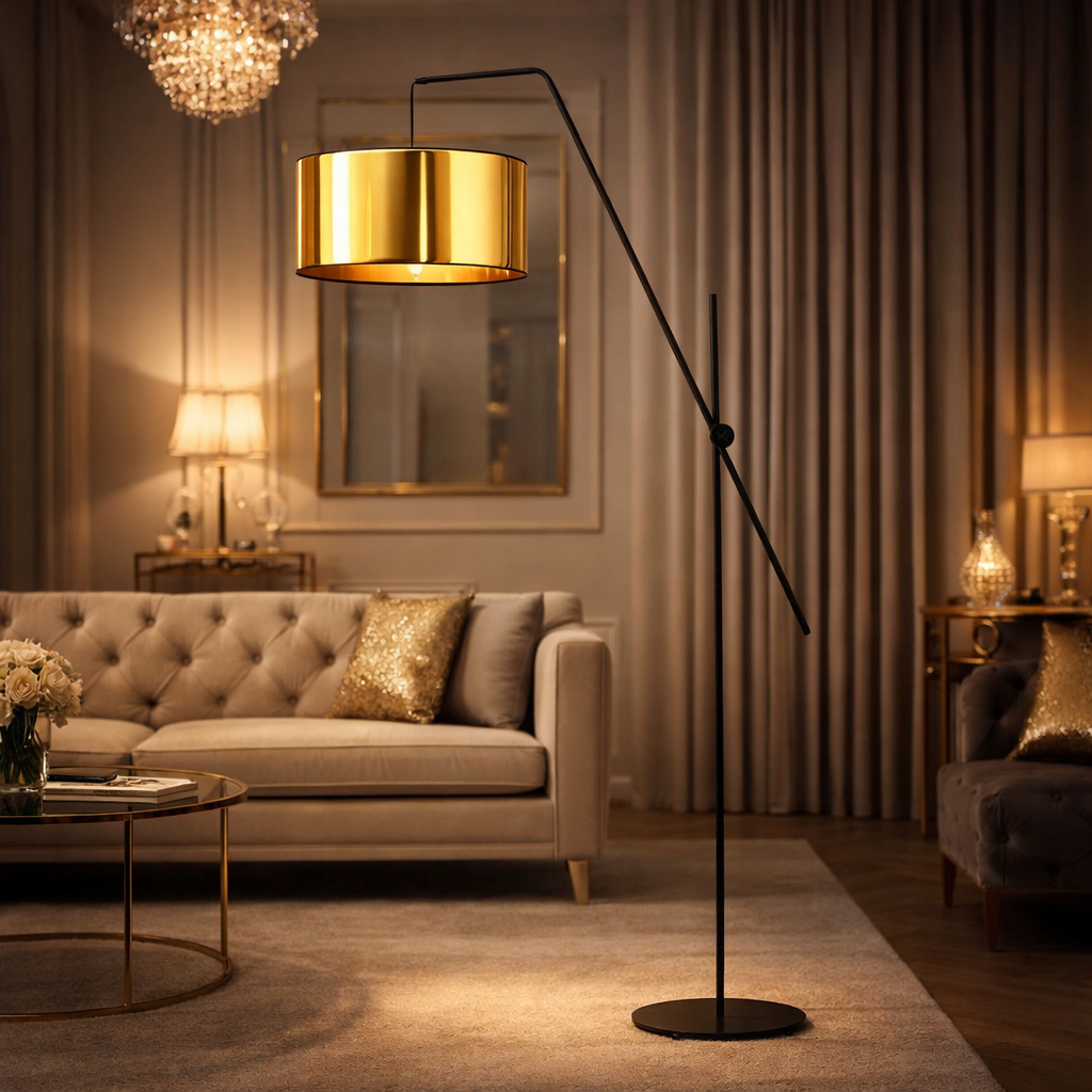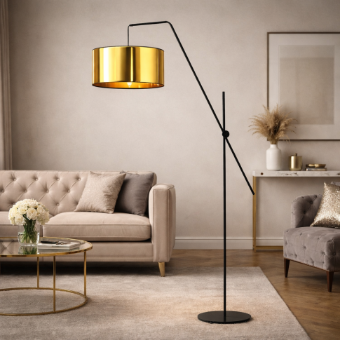Czarna lampa stojąca z wysięgnikiem idealnie prezentuje się jako funkcjonalny dodatek wnętrza przyciągający wzrok, który po włączeniu stanie się prawdziwą iluminacją świetlną. Oprawa reprezentuje nowoczesny styl, w którym dominuje minimalizm i prostota. Abażur posiada cylindryczny kształt o średnicy 40 cm i wysokości 20 cm a jego faktura charakteryzuje się gładką, lustrzaną powierzchnią. Czarna lampa stojąca BILBAO MIRROR jako bestsellerowy model oświetlenia polskiego producenta lamp LYSNE.PL to innowacyjna propozycja oświetlenia w której regulacji podlega nie tylko wysokość ale i szerokość oprawy. Złota lampa podłogowa na wysięgniku ruchomym BILBAO MIRROR posiada przewód zasilający ukryty w stelażu oprawy, dzięki czemu oprawa zyskuje dodatkowe punkty za estetyczny wygląd. Na przewodzie zasilającym wychodzącym spod okrągłej, metalowej podstawy zlokalizowany jest praktyczny włącznik nożny ułatwiający użytkowanie lampy.