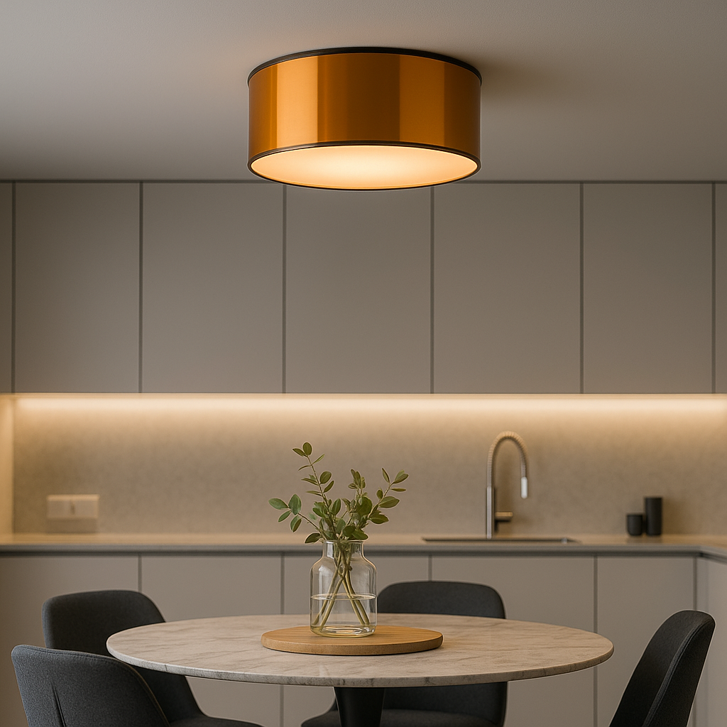 Plafon z abażurem w kolorze miedzianym DUBAJ MIRROR to przykład minimalistycznego oświetlenia. Ta lampa sufitowa wygląda doskonale nie tylko we wnętrzach nowoczesnych ale także skandynawskich czy loftowych. Ciekawym rozwiązaniem zastosowanym w oprawie jest niewidoczna nóżka, dzięki której plafoniera zyskuje dodatkowe punkty za wygląd i estetykę. Przylegający do sufitu plafon loftowy sprawdzi się doskonale w wielu wnętrzach. Może stać się ozdobą eleganckiej kuchni, nowoczesnej sypialni, holu czy przedpokoju. Ze względu na swój minimalistyczny design oprawa dobrze sprawdzi się także w roli miedzianej lampy w salonie urządzonej w stylu glamour. DUBAJ MIRROR sprawdzi się nie tylko w standardowych przestrzeniach, ale także we wnętrzach wymagających specjalnego traktowania np. mieszkaniach na poddaszu ze skośnym sufitem.