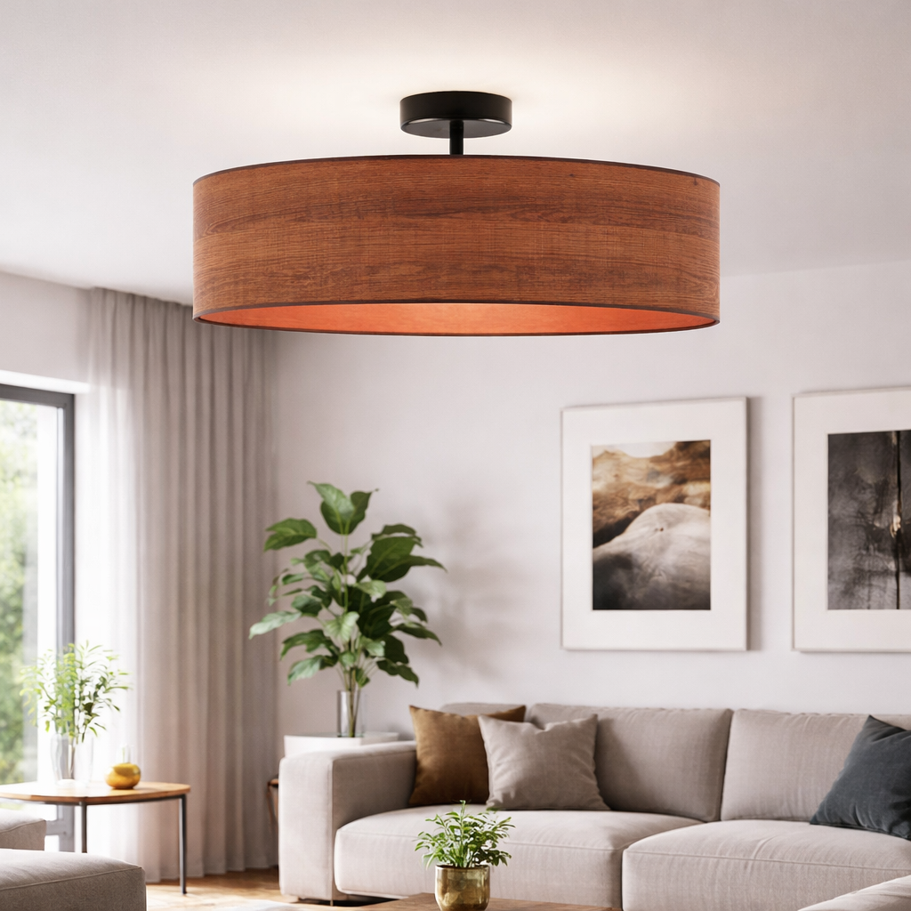 To, co wyróżnia dużą lampę sufitową do salonu GRENADA ECO to imponujący rozmiar abażura – aż 80 cm średnicy – oraz jego wyjątkowa struktura przypominająca naturalny fornir. Abażur wykonano z tkaniny PVC o wytłaczanym wzorze słojów drewna, co nadaje lampie unikalnego charakteru i elegancji. Po włączeniu światła wzór staje się jeszcze bardziej widoczny, tworząc w pomieszczeniu przytulną, ciepłą atmosferę. Abażur dostępny jest w kilku ponadczasowych kolorach inspirowanych naturą: orzechowy, dąb sonoma oraz kasztanowy. Możliwość wyboru barwy pozwala dopasować plafon do różnych aranżacji – od jasnych wnętrz w stylu skandynawskim po ciemniejsze, nowoczesne przestrzenie industrialne.