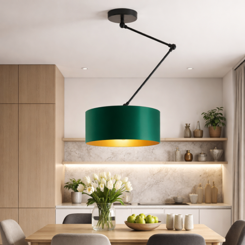 Czarna lampa sufitowa z abażurem w kolorze zieleni butelkowej NEWA GOLD sprawia, że świetnie komponuje się z wnętrzami nowoczesnymi jak i glamour, choć równie dobrze prezentuje się w aranżacjach skandynawskich i loftowych. Niezależnie od wybranego stylu oprawa jest uniwersalnym dodatkiem, który podkreśli walory każdego pomieszczenia. Warto również wspomnieć, że lampa sufitowa na regulowanym ramieniu NEWA wyprodukowana została w Polsce. Gwarantuje to solidność wykonania, które przekłada się na długotrwałe, bezusterkowe użytkowanie. W przypadku tego modelu potrzebować będziesz jednej żarówki tradycyjnej lub ledowej o maksymalnej mocy 60W oraz wyposażonej w gwint E27.