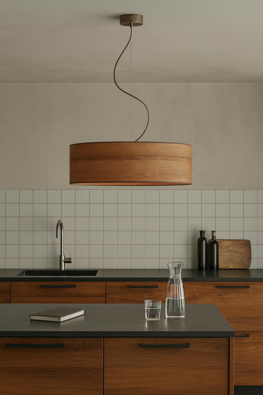 Dekoracyjna i funkcjonalna – to dwa najważniejsze atuty, które wyróżniają nowoczesną lampę wiszącą HAJFA ECO. Model ten łączy w sobie ekologiczny design i skandynawską prostotę tworząc wyjątkowe oświetlenie do nowoczesnych wnętrz. Kolekcja ECO została zaprojektowana z myślą o miłośnikach natury – jej charakterystyczne abażury z tworzywa PVC posiadają strukturę przypominającą fornir drewniany, dzięki czemu wyglądają naturalnie i stylowo. To idealna propozycja dla osób, które cenią połączenie prostoty i elegancji. Żyrandol do salonu HAJFA ECO doskonale sprawdzi się jako centralna lampa sufitowa w salonie, sypialni, jadalni czy kuchni. Subtelne, rozproszone światło i stonowana forma sprawiają, że model ten pasuje zarówno do wnętrz w stylu boho i scandi jak i do industrialnych aranżacji z elementami szkła, cegły czy metalu.