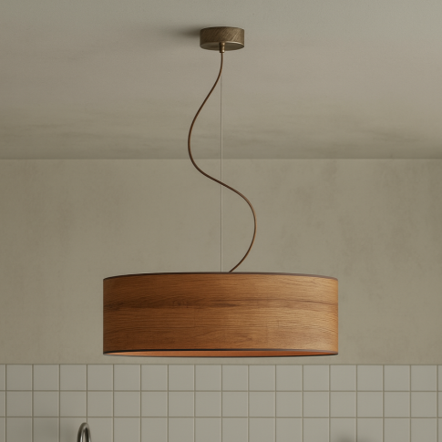 Abażurowa lampa wisząca HAJFA ECO daje pełną swobodę dopasowania wyglądu do indywidualnych potrzeb. Wybierając spośród kilku odcieni imitacji forniru możesz dopasować abażur do koloru mebli, podłogi lub dodatków. Dodatkowo producent umożliwia personalizację zawieszenia i stelaża, które dostępne są aż w pięciu wariantach kolorystycznych. Tak zaprojektowana lampa wisząca do salonu lub sypialni ożywi każde wnętrze ciepłym, rozproszonym światłem i doda mu przytulnego klimatu. Bez względu na to, czy zdecydujesz się na jasne odcienie drewna czy ciemniejsze tony, designerskie oświetlenie z kolekcji ECO zawsze prezentuje się elegancko i ponadczasowo.