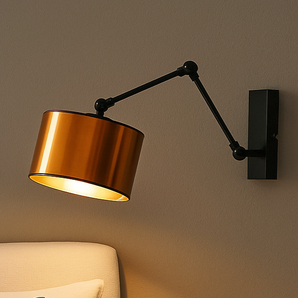 Lampa ścienna z regulacją wysokości i kąta świecenia TULON MIRROR wyposażona jest w abażur wykonany z wysokogatunkowego materiału PVC o gładkiej, lustrzanej powierzchni, dostępny w dwóch eleganckich kolorach: złotym oraz miedzianym. Odbijające światło wykończenie nadaje całości wyrafinowanego charakteru i sprawia, że kinkiet doskonale komponuje się z wnętrzami w stylu nowoczesnym, glamour, art déco czy industrialnym. Odbite światło subtelnie wypełnia przestrzeń ciepłym blaskiem, tworząc atmosferę sprzyjającą relaksowi. Delikatnie przenikające przez klosz światło żarówki dodaje całości loftowego charakteru i wyjątkowej głębi. To designerska lampa ścienna z abażurem, która łączy ozdobny wygląd z wysoką funkcjonalnością.