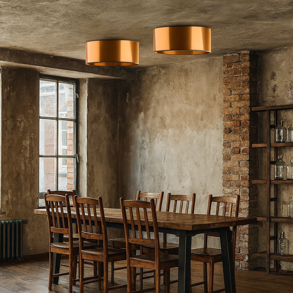 Centralnym punktem plafonu jest abażur o średnicy 30 cm, utrzymany w głębokim odcieniu miedzi i wykończony kontrastującą czarną lamówką. Wykonany z połyskliwego PVC, przypomina taflę lustra, w której światło odbija się w spektakularny sposób. Ciepłe, miedziane refleksy rozchodzą się delikatnie po wnętrzu, tworząc atmosferę sprzyjającą relaksowi i komfortowi. To oświetlenie, które działa nie tylko praktycznie, ale i zmysłowo – szczególnie w zestawieniu z dekoracyjnymi żarówkami Edisona, które stają się integralnym elementem kompozycji. Lampa sufitowa miedziana DUBAJ MIRROR to idealna propozycja dla tych, którzy cenią połączenie designu z klimatem.