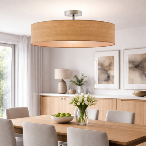 To, co wyróżnia dużą lampę sufitową do salonu GRENADA ECO to imponujący rozmiar abażura – aż 80 cm średnicy – oraz jego wyjątkowa struktura przypominająca naturalny fornir. Abażur wykonano z tkaniny PVC o wytłaczanym wzorze słojów drewna, co nadaje lampie unikalnego charakteru i elegancji. Po włączeniu światła wzór staje się jeszcze bardziej widoczny, tworząc w pomieszczeniu przytulną, ciepłą atmosferę. Abażur dostępny jest w kilku ponadczasowych kolorach inspirowanych naturą: orzechowy, dąb sonoma oraz kasztanowy. Możliwość wyboru barwy pozwala dopasować plafon do różnych aranżacji – od jasnych wnętrz w stylu skandynawskim po ciemniejsze, nowoczesne przestrzenie industrialne.