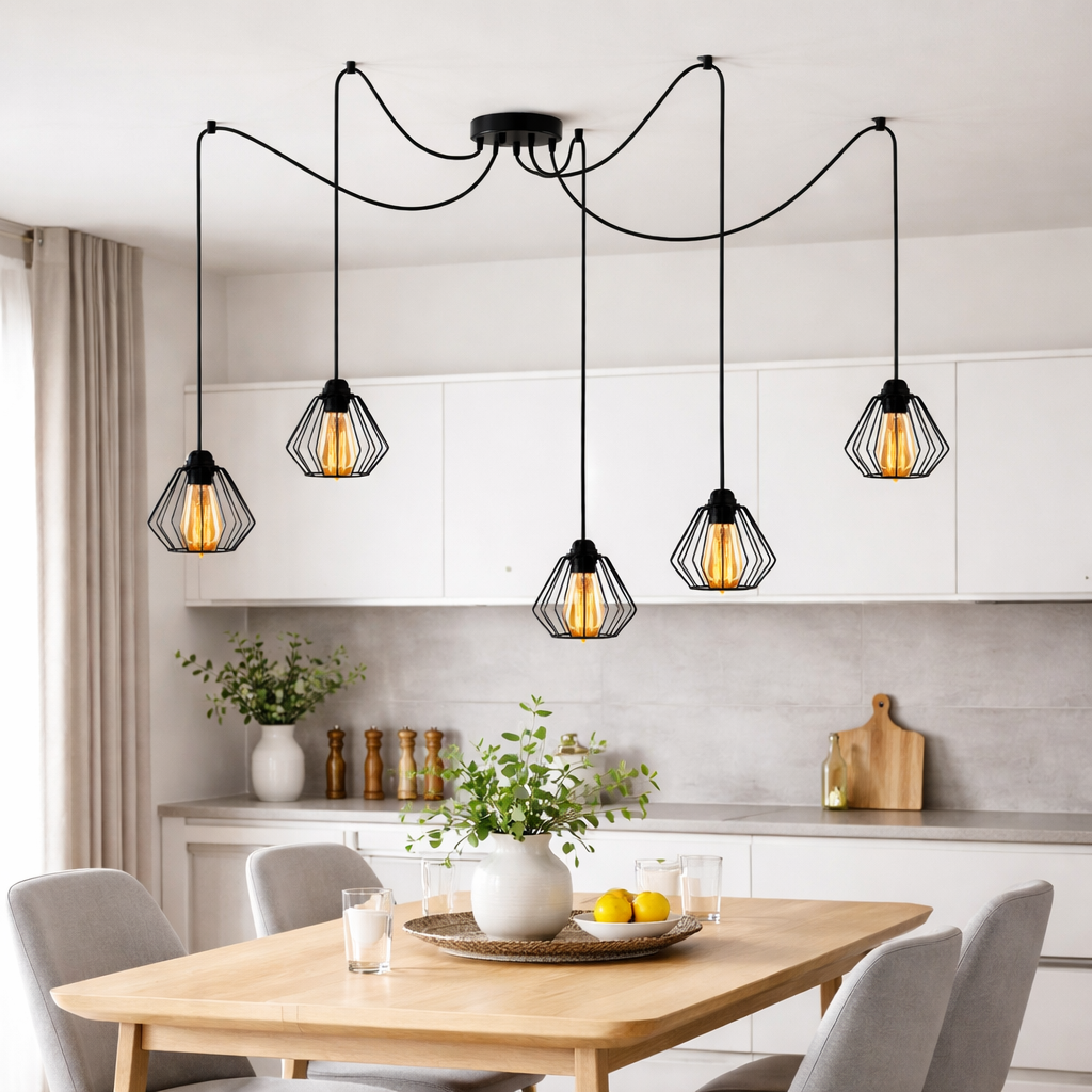 Styl loftowy z roku na rok staje się coraz bardziej modny i popularny. Postindustrialne aranżacje to przede wszystkich przestronne, otwarte i wysokie wnętrza, które wymagają funkcjonalnego i dobrze dobranego oświetlenia. Ważne jest, aby pamiętać o tym, że lampa wisząca pająk z kloszami powinna nie tylko pięknie się prezentować, ale także być praktyczna. Pomieszczenia industrialne to dość trudne wnętrza do oświetlenia, dlatego miłośnicy loftów często decydują się na zakup kilku żyrandoli. DIORO L5 to alternatywa dla tego rozwiązania - choć lampa jest jedna, posiada aż pięć źródeł światła. Dodatkowo przewody lampy wiszącej spider umożliwiają pełną dowolność w zawieszeniu oprawy. Dodatkowym atutem są także elementy mocujące dołączone do zestwu. Dzięki temu jeden żyrandol oświetli cały loftowy salon czy sypialnię. To świetna opcja dla miłośników funkcjonalności, którzy jednocześnie cenią sobie minimalizm.