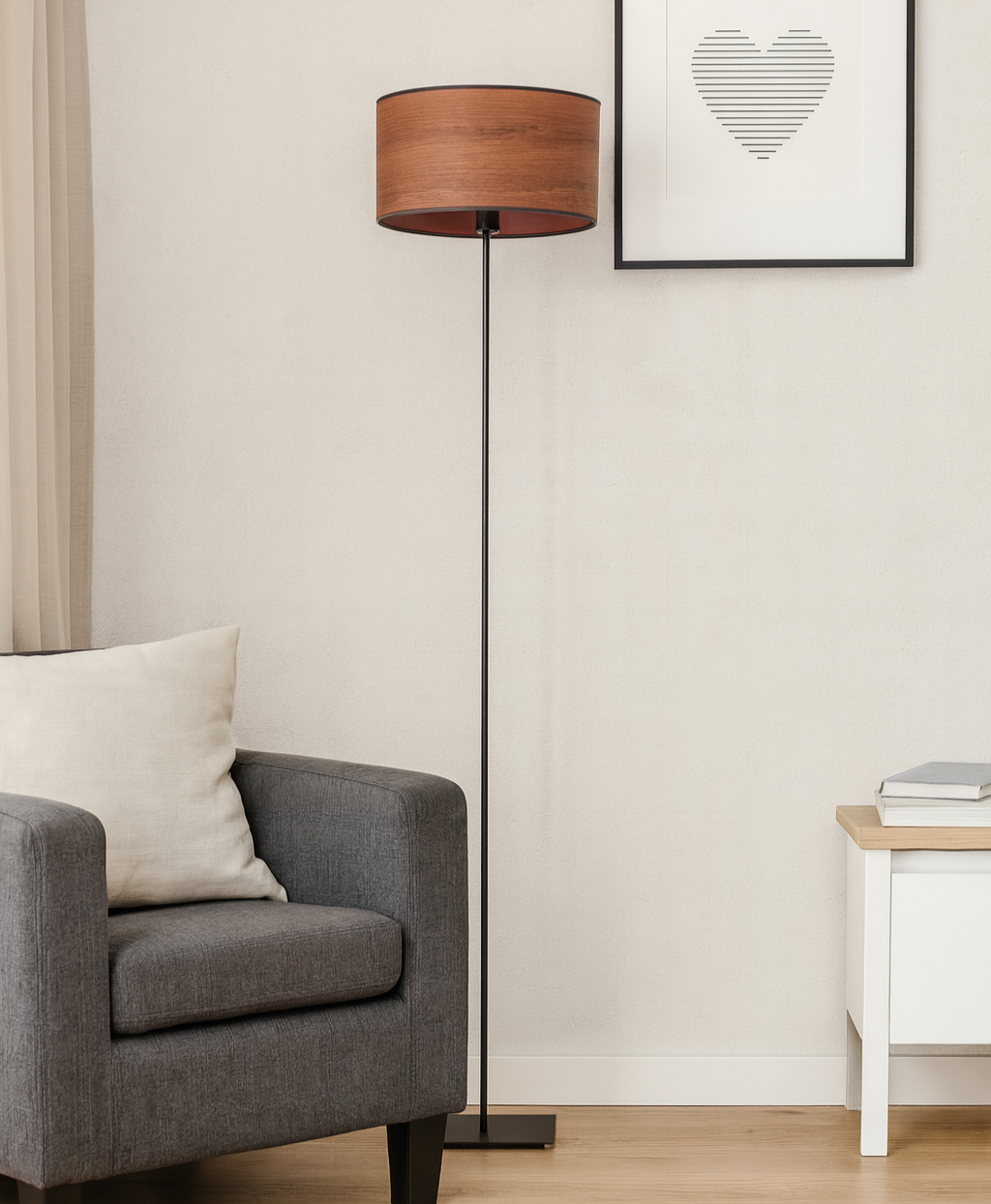 MEKSYK GOLD to nowoczesna lampa podłogowa, która wyróżnia się szeroką paletą kolorów zarówno w przypadku podstawy jak i abażuru. Metalowa podstawa dostępna jest w sześciu wariantach kolorystycznych, co pozwala dopasować ją do różnych aranżacji. Cylindryczny abażur o wymiarach 30 cm x 15 cm wykonany jest z materiału PVC z wytłoczonym wzorem imitującym strukturę słojów drewna, co nadaje lampie unikalny i naturalny wygląd. Dostępność abażuru w kilku kolorach sprawia, że piękna lampa stojąca do salonu z łatwością harmonizuje z wieloma stylami wnętrzarskimi – od skandynawskiego minimalizmu po nowoczesny glamour.
