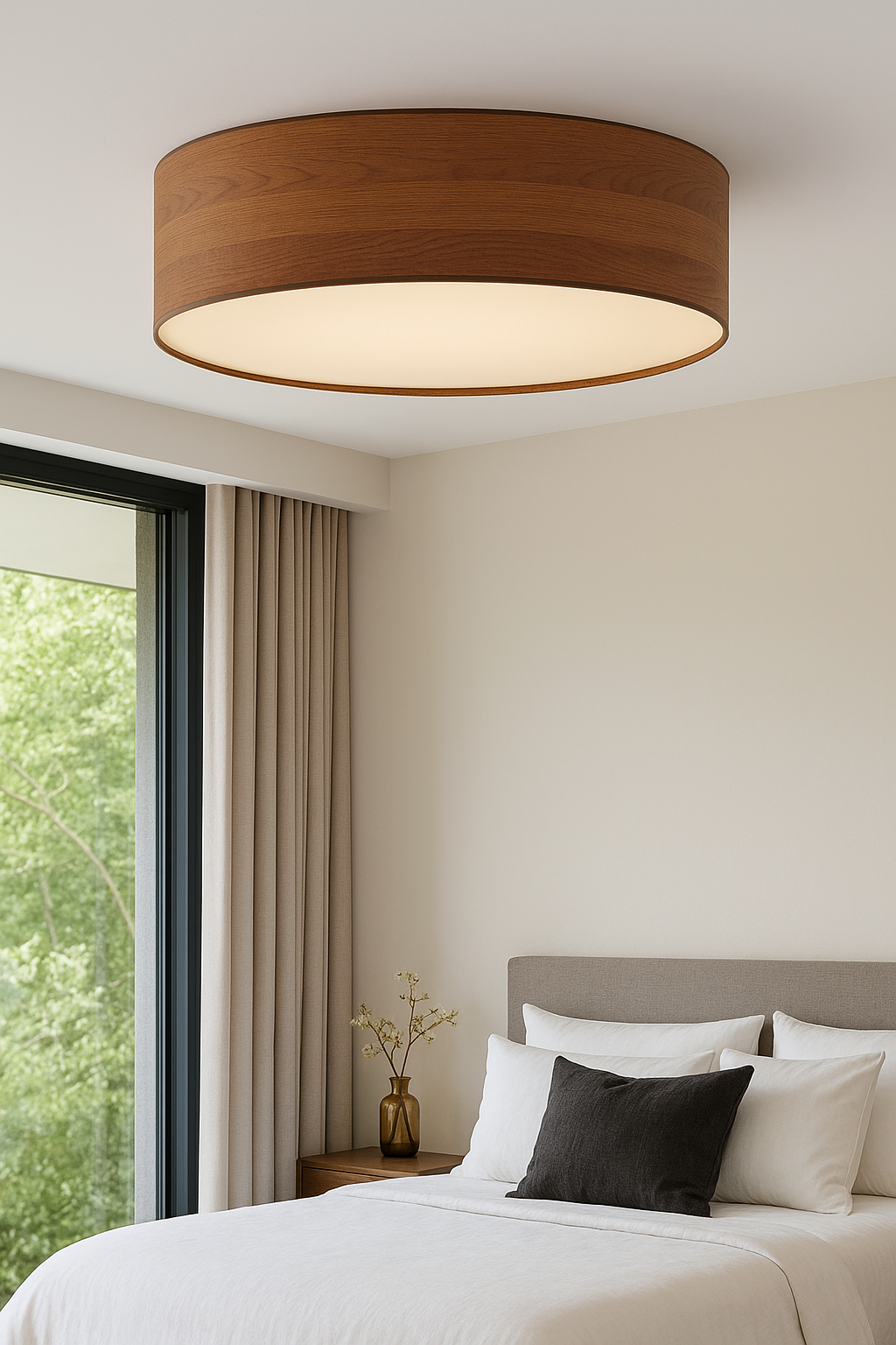 Plafon dostępny jest w dwóch dużych rozmiarach: plafon sufitowy 80 cm oraz plafon sufitowy 100 cm. Dzięki temu doskonale sprawdza się jako plafon do dużego salonu, gdzie potrzeba mocnego i równomiernego oświetlenia. Większy model (100 cm) świetnie nadaje się do przestronnych jadalni i otwartych salonów połączonych z kuchnią. Okrągła forma sprawia, że MEDINA ECO można określić jako plafon sufitowy okrągły, a dzięki wykończeniu imitującemu drewno również jako plafon sufitowy drewniany czy plafon sufitowy fornirowy. To sprawia, że model jest uniwersalny i łatwy do dopasowania do różnych stylów aranżacyjnych – od skandynawskich, przez industrialne, aż po eleganckie klasyczne wnętrza.