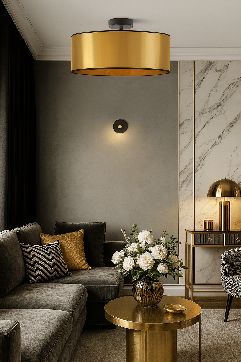 Dzięki swojej formie i kolorystyce ta złota plafoniera sufitowa świetnie sprawdzi się w roli lampy do salonu, lampy sufitowej do kuchni, designerskiego oświetlenia nad stół, a także nowoczesnej lampy do sypialni. Złota oprawa tworzy wyraziste oświetlenie glamour, które podkreśla elegancję wnętrz i dodaje im ekskluzywnego charakteru. To idealne rozwiązanie również dla przestrzeni komercyjnych – restauracji, hoteli, showroomów czy salonów beauty – gdzie liczy się styl, spójność aranżacji i jakość światła. Różne warianty średnic (30–60 cm) pozwalają tworzyć efektowne zestawy świetlne dopasowane do wielkości pomieszczenia. Ten plafon w stylu glamour to świetna propozycja dla osób, które chcą wyróżnić wnętrze i dodać mu luksusowego blasku.