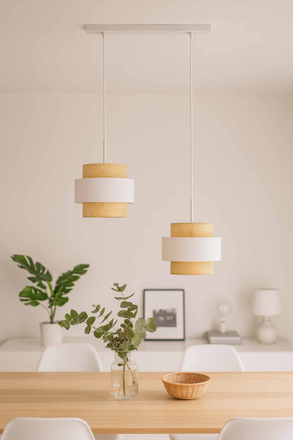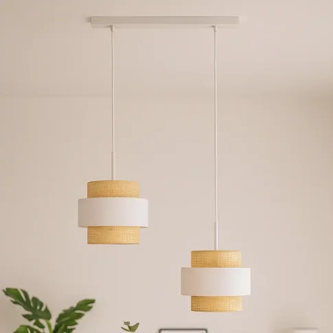 Szukasz minimalistycznego oświetlenia z nutą nowoczesnego designu? Mamy dla Ciebie idealną propozycję – lampa wisząca MADERA BOHO urzeka wyjątkowym stylem i funkcjonalnością. MADERA BOHO to model oświetlenia typu zwis, który sprawdzi się nie tylko nad rodzinnym stołem czy wyspą kuchenną. Designerska lampa wisząca z 2 punktami światła ma regulowaną wysokość (do 120 cm), co pozwala na jej montaż zarówno w wysokich pomieszczeniach, jak i tych niższych. Ten oryginalny żyrandol w stylu boho można także zamontować w salonie czy sypialni nad łóżkiem. Gdzie jeszcze warto wprowadzić rustykalne oświetlenie na listwie? To już zostawiamy do przemyślenia każdemu z Was. Lampa wisząca boho od polskiego producenta oświetlenia LYSNE.PL składa się z metalowej konstrukcji w formie listwy dostępnej w kolorze białym lub czarnym. Elementem dekoracyjnym są dwa rattanowe abażury w formie tuby. Każdy z nich ma także tkaninowy pierścień okalający klosz. Aby idealnie wkomponować oprawę do swojego wnętrza, przygotowaliśmy do wyboru dwie wersje kolorystyczne abażuru z pierścieniami: białym lub czarnym. Przyjemne światło wydobywające się przez klosz stanie się idealnym dodatkiem do wieczornego odpoczynku. Natomiast w ciągu dnia żyrandol w stylu boho doda modnego charakteru do wnętrz. Do oprawy możemy zastosować tradycyjne żarówki o mocy 60W lub żarówki LED o klasach energetycznych od A do G. MADERA dostosowana jest także do włączników 2-klawiszowych.