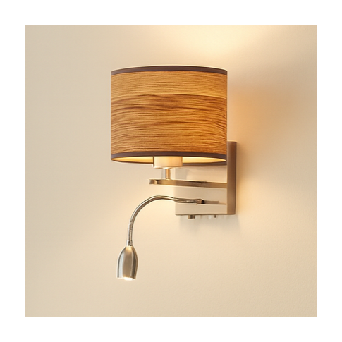 Ledowy kinkiet ścienny z abażurem LED SENEGAL z kolekcji ECO produkowany jest w 2 wariantach kolorystycznych stelaża - eleganckim chromie i nowoczesnej stali szczotkowanej. Cylindryczny abażur o średnicy 12 cm i wysokości 17,5 cm to tzw. fornir, czyli materiał PVC, który strukturą przypomina słoje drewna. Dostępny jest w 3 kolorach: orzechowy, dąb sonoma oraz kasztanowy. Wielką zaletą producenta oświetlenia LYSNE.PL jest możliwość dowolnej modyfikacji lampy pod względem kolorystycznym, co daje możliwość dopasowania oprawy do wielu stylów i kolorów aranżacji wnętrz. Wysokość całej lampy wynosi 25 cm, szerokość 18 cm, a głębokość 22 cm, co czyni ją kompaktowym rozwiązaniem pasującym do wielu wnętrz. Dzięki swoim wymiarom kinkiet doskonale sprawdzi się zarówno w mniejszych pomieszczeniach, jak i w przestronnych aranżacjach.