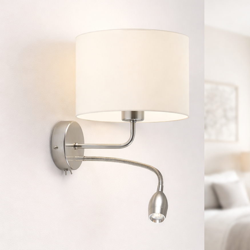 Lampa ścienna CAPRI urzeka swoim designem i funkcjonalnością. Uniwersalna forma sprawia, że doskonale wkomponuje się do każdego pokoju, a także lokalu usługowego. Kinkiet LED został wykonany z wysokiej jakości materiału. Zatem jest bezpiecznym i bezawaryjnym produktem. Projektanci w tym modelu chromowanego kinkietu oprócz światła przedostającego się przez abażur wprowadzili drugie źródło światła. Jest nim regulowane oświetlenie LED na wysięgniku. Giętki panel LED ma maksymalnie 34 cm długości. Jego wielką zaletą jest możliwość regulacji i skierowanie światła dokładnie tam, gdzie chcemy. Dzięki temu kinkiet LED może posłużyć jako lampa ścienna do czytania w sypialni, lampka ścienna do pracy, a także lampka nocna w dziecięcym pokoju. Szeroka oferta kolorystyczna abażurów sprawia, że prostokątny kinkiet ścienny wpasuje się we wnętrza zaaranżowane w dowolnym stylu. Kinkiet ścienny do sypialni CAPRI posiada 25 cm wysokości i szerokości. Klosz został wykonany z holenderskiej tkaniny, a stelaż jest z metalu w kolorze chromu bądź stali szczotkowanej.