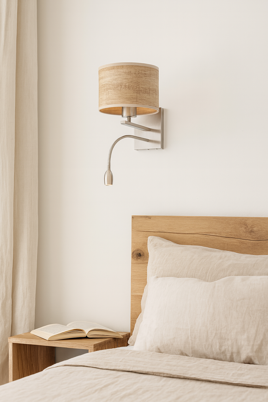 Ledowy kinkiet ścienny z abażurem LED SENEGAL z kolekcji ECO produkowany jest w 2 wariantach kolorystycznych stelaża - eleganckim chromie i nowoczesnej stali szczotkowanej. Cylindryczny abażur o średnicy 12 cm i wysokości 17,5 cm to tzw. fornir, czyli materiał PVC, który strukturą przypomina słoje drewna. Dostępny jest w 3 kolorach: orzechowy, dąb sonoma oraz kasztanowy. Wielką zaletą producenta oświetlenia LYSNE.PL jest możliwość dowolnej modyfikacji lampy pod względem kolorystycznym, co daje możliwość dopasowania oprawy do wielu stylów i kolorów aranżacji wnętrz. Wysokość całej lampy wynosi 25 cm, szerokość 18 cm, a głębokość 22 cm, co czyni ją kompaktowym rozwiązaniem pasującym do wielu wnętrz. Dzięki swoim wymiarom kinkiet doskonale sprawdzi się zarówno w mniejszych pomieszczeniach, jak i w przestronnych aranżacjach.