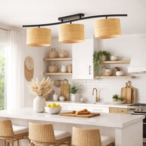 Regulowana lampa sufitowa CARTAGENA BOHO to nowoczesna i stylowa propozycja oświetlenia wewnętrznego, stworzona z myślą o miłośnikach naturalnych materiałów oraz niebanalnego designu. Model ten doskonale wpisuje się w popularne obecnie aranżacje wnętrz w stylu boho, skandynawskim, eko, a także nowoczesnym minimalizmie. Lampa sufitowa z regulowanymi kloszami wyposażona jest w 3 cylindryczne abażury o średnicy około 17,5 cm, wykonane z tkaniny o splocie rattanu. Dla lepszej trwałości i estetyki od wewnątrz zostały one podklejone folią PVC, dzięki czemu nie odkształcają się i efektownie rozpraszają światło. Abażury zamontowane są na metalowym stelażu o delikatnie wygiętym profilu, co nadaje plafonowi subtelnej lekkości i nowoczesnego charakteru. CARTAGENA BOHO to 3-punktowa plafoniera, która zapewnia doskonałe oświetlenie pomieszczenia jednocześnie stanowiąc jego dekoracyjny element. Produkt jest w 100% polskiej produkcji i wykonany został z wysokiej jakości materiałów. To idealny wybór do salonu, jadalni, sypialni, a także przestrzeni komercyjnych takich jak kawiarnie, restauracje czy butiki.