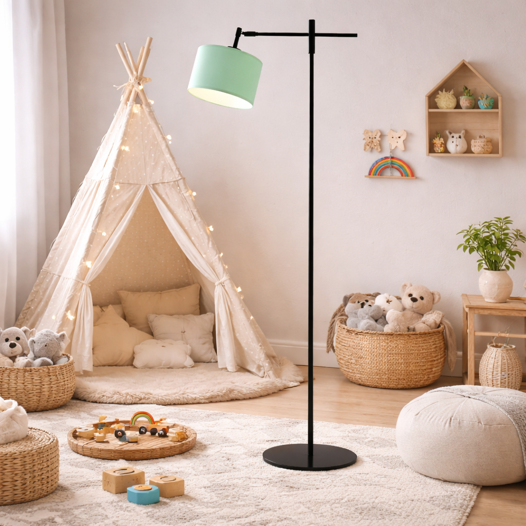 Regulowana lampa stojąca z miętowym abażurem SERES do pokoju dziecięcego