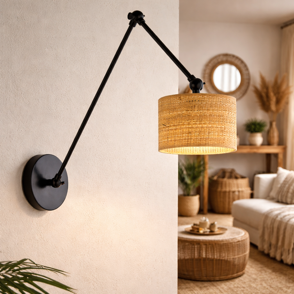 Kinkiet z regulacją TESNUS to wszechstronne i stylowe rozwiązanie oświetleniowe, które łączy w sobie nowoczesny design z funkcjonalnością. Z jego pomocą możesz łatwo dostosować kierunek światła do indywidualnych potrzeb. Lampa ścienna na wysięgniku jest idealna zarówno do oświetlenia konkretnych przestrzeni jak i jako element dekoracyjny dodający wnętrzom charakteru. Oprawa o regulowanej wysokości 93 cm i szerokości 93 cm, wyposażona w klosz o średnicy 17,5 cm, zapewnia odpowiednie rozproszenie światła, co czyni ją doskonałym wyborem do różnorodnych zastosowań. Kinkiet ścienny w stylu boho to znakomita propozycja dla miłośników naturalnych materiałów i ciepłej, domowej atmosfery. Rattanowy abażur ozdobiony elegancką lamówką w tym samym kolorze wprowadza do wnętrz nie tylko światło, ale i unikatowy klimat. Czarny kolor podstawy stanowi stylowe uzupełnienie designu, nadając całości spójny i nowoczesny charakter.