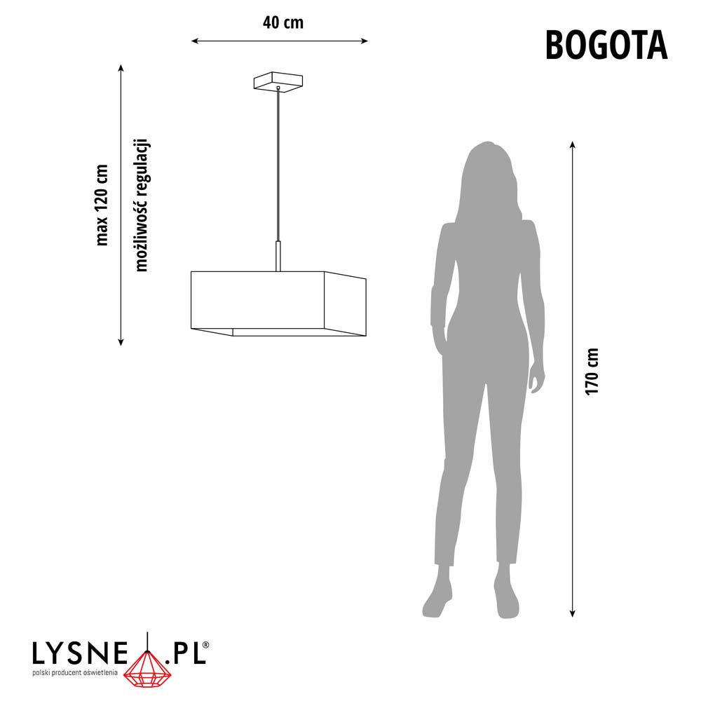 Szukasz żyrandola o wyjątkowym designie i tkaninowym abażurze, przez który światło przechodzi w delikatny sposób? Jeśli tak, to sprawdź wszystkie możliwości lampy wiszącej BOGOTA zachwycającej ponadczasową elegancja. Uniwersalny wygląd lampy czyni ją idealną do wielu pomieszczeń w mieszkaniu i lokalach usługowych. Stylowa lampa sufitowa BOGOTA składa się z tkaninowego klosza w kształcie kwadratu o wymiarach 40x40 cm i wysokości 20 cm oraz z zawieszki z metalowym elementem. To oświetlenie sufitowe oprócz swojej praktycznej strony, doskonale spełnia także dekoracyjną rolę w salonie czy jadalni. Lampa wisząca ma regulowany zwis, co czyni ją niezwykle funkcjonalnym oświetleniem, perfekcyjnie dopasowanym do naszych, indywidualnych potrzeb. Maksymalna długość to 120 cm, minimalna na jaką możemy skrócić przewód zasilający to ok. 20 cm. Ale to nie koniec! Oprócz regulacji długości, mamy szeroki wybór w zakresie liczby żarówek (od 1 do 5), koloru klosza (kilkanaście barw) i tonacji stelaża (5 wariantów). Żyrandol BOGOTA jest przystosowany do standardowych żarówek z gwintem E27 i źródeł światła o klasach energetycznych od A do G i żarówek LED.
