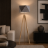 Drewniana lampa stojąca trójnóg LAGOS z designerskim abażurem