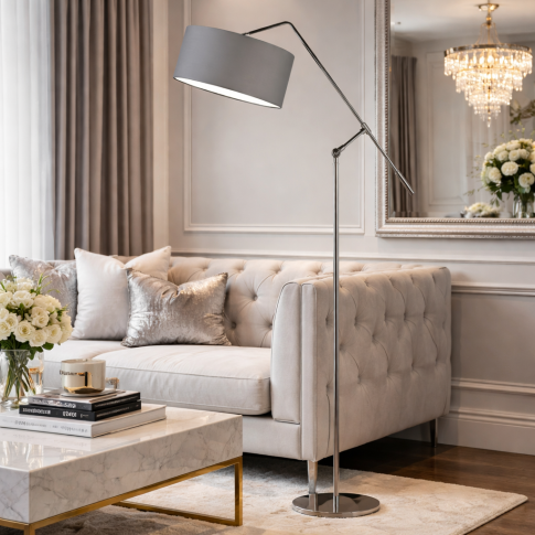 Polski producent nowoczesnego oświetlenia LYSNE.PL wychodzi naprzeciw oczekiwaniom najbardziej wymagających klientów i przedstawia projekt lampy podłogowej, która jest designerska, uniwersalna i niezwykle praktyczna. Regulowana lampa stojąca LIBERIA z kolekcji CLASSIC ma w sobie wszystkie te cechy. Składa się z metalowej konstrukcji w trzech kolorach do wyboru — białym, srebrnym lub czarnym, z możliwością ustawienia kąta padania światła oraz wysokiego na 20 cm i szerokiego na 40 cm abażura w kształcie walca. W ofercie sklepu online znajduje się szeroka gama kolorystyczna kloszy. Możesz wybierać między białym, ecru, jasnym szarym (gołębim), miętowym, musztardowym, jasnym różowym, jasnym fioletowym, beżowym, szarym (stalowym), czerwonym, niebieskim, fioletowym, granatowym, grafitowym, brązowym, czarnym oraz modnym betonowym lub odcieniem butelkowej zieleni. Jeśli szukasz wysokiej lampy podłogowej — LIBERIA jest właśnie dla Ciebie. Mierzy 170 cm wysokości i 77 cm szerokości, a dodatkowo oba te wymiary można dowolnie regulować. W parze z nowoczesnym designem idzie najwyższa jakość. Stelaż lampy wyprodukowany jest z elementów metalowych, a abażur pokrywa holenderska tkanina tekstylna, podklejona na folii PCV. LIBERIA wyposażona jest w 1 źródło światła o mocy 60W (lub żarówek LED) mocowanych na tzw. duży gwint E27.