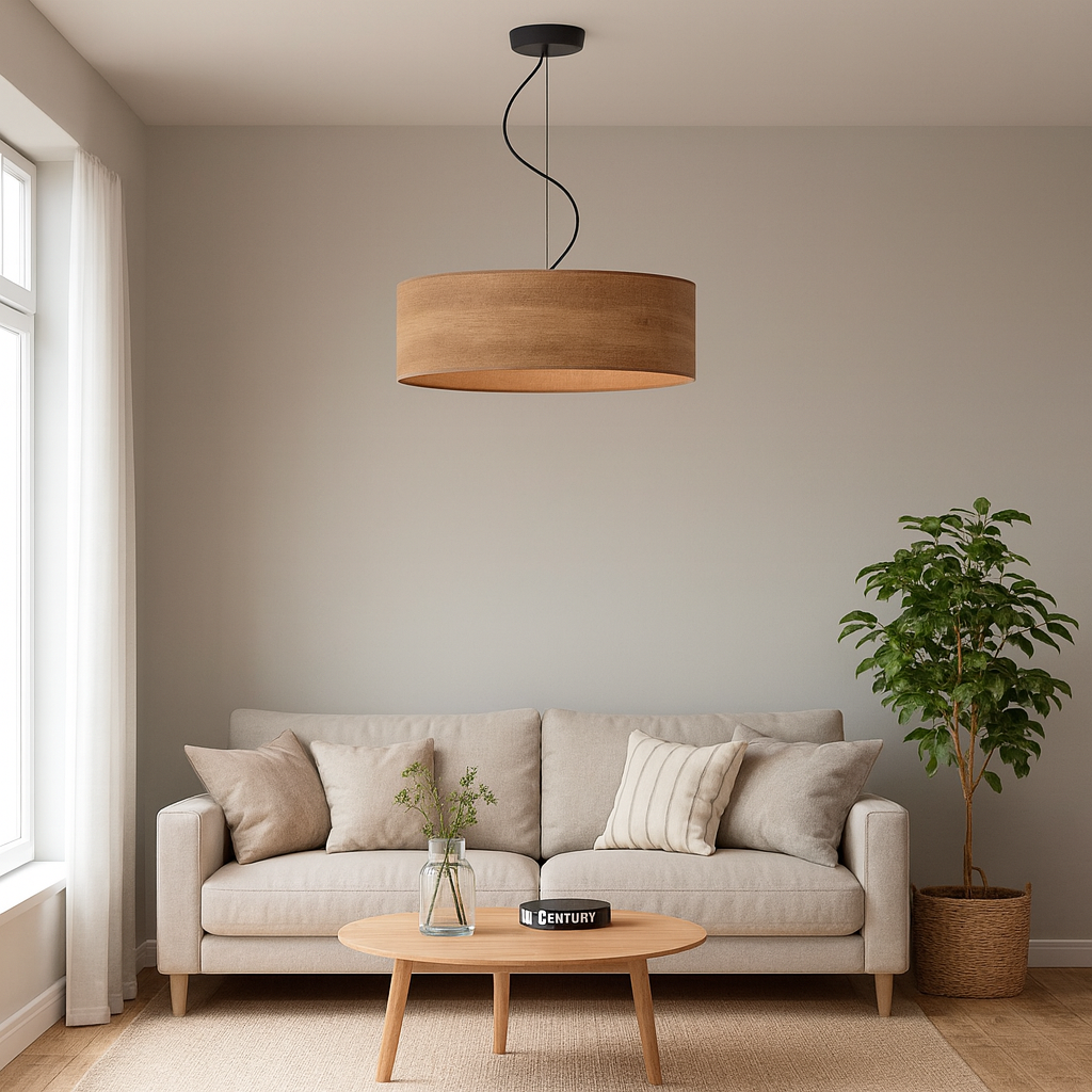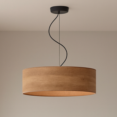 Lampa wisząca z abażurem o średnicy 50 cm HAJFA ECO z oferty sklepu LYSNE.PL to idealne połączenie stylu skandynawskiego, nowoczesnego designu i funkcjonalnego oświetlenia. Jej abażur z tworzywa PVC o strukturze drewna (à la fornir) zachwyca naturalnym wyglądem, wpisując się w aktualne trendy eko w aranżacji wnętrz. Ten efektowny żyrandol do salonu to wybór dla osób ceniących prostotę, harmonię i przytulny klimat w domu. Designerska lampa wisząca doskonale sprawdzi się jako oświetlenie do salonu, kuchni i sypialni wprowadzając do wnętrza ciepłe, miękkie światło oraz przyjemną atmosferę.