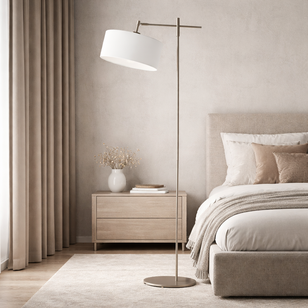 Twoje mieszkanie jest urządzone w nowoczesny sposób? Właśnie ten styl jest bliski Tobie i Twoim najbliższym? To powinieneś już szukać miejsca na ruchomą lampę podłogową MELTON. Ten model idealnie pasuje do sypialni, salonu, jadalni urządzonych zgodnie z najnowszymi trendami. Prosty kształt i minimalistyczna forma sprawiają, że jest to uniwersalna lampa o szerokim przeznaczeniu. W skład designerskiej lampy stojącej wchodzi metalowy stelaż ze stabilną, okrągłą podstawą. W górnej części mamy zawieszone prostopadle do podstawy ramię, które jest zakończone tkaninowym abażurem. Cylindryczny klosz o wymiarach 30x15 cm pięknie podkreśla charakter wnętrza. Polski producent oświetlenia LYSNE.PL oferuje 3 kolory stelaża do wyboru oraz 20 różnych barw abażuru. Tak bogata kolorystyka sprawia, że każdy może dopasować lampę do aranżacji pokoju. W ofercie są także odcienie pastelowe idealne do pokoju dziecięcego czy noworodka. Wraz z zakupem lampy podłogowej z regulowanym ramieniem MELTON otrzymujemy 2-letnią gwarancję od producenta oraz unijny certyfikat zgodności CE.