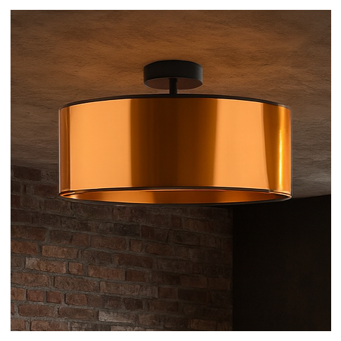 Nowoczesna lampa sufitowa WENECJA MIRROR fi - 60 cm to wyjątkowa miedziana plafoniera, która łączy funkcjonalność, estetykę i luksusowy charakter. Cylindryczny abażur wykonany z materiału PVC tworzy efektowny miedziany klosz, idealny do wnętrz nowoczesnych, glamour i industrialnych. Ciepły połysk miedzi nadaje przestrzeni przytulnego, eleganckiego klimatu, a delikatnie przenikające światło buduje nastrojową atmosferę. To designerska lampa sufitowa, która świetnie prezentuje się z dekoracyjnymi żarówkami Edison, dodając wnętrzu oryginalności i wyrazistego stylu. Stabilna czarna podsufitka nadaje konstrukcji nowoczesnej lekkości i doskonale podkreśla kolor miedzi.