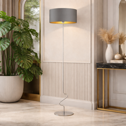 Oryginalna lampa podłogowa do salonu z szarym abażurem ze złotym wnętrzem JERSEY GOLD