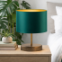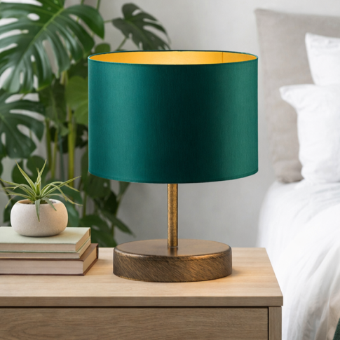 Lampka nocna ze szmaragdowym abażurem AWINION GOLD to kwintesencja elegancji zawarta w kompaktowym rozmiarze. Idealna dla tych, którzy cenią wyrafinowanie i funkcjonalność. Cylindryczny abażur o wysokości 12 cm i szerokości 17,5 cm zapewnia optymalne rozproszenie światła, delikatnie wypełniając pomieszczenie miękkim, ciepłym blaskiem. Materiałowy abażur ze złotym wnętrzem tworzy atmosferę spokoju i relaksu, doskonałą do nocnego czytania lub spokojnego snu. Złote wnętrze klosza dodatkowo wzmacnia ciepły blask, który delikatnie otula wnętrze nadając mu przytulnego ale i luksusowego charakteru. Żółto-złote refleksy nie tylko podkreślają elegancję oprawy, ale również tworzą wyjątkowo relaksującą atmosferę. Dzięki swojej oszczędnej formie lampka nocna do kontaktu doskonale wpisze się w małe przestrzenie nie tracąc przy tym swojego uroku. Zaskakująco wszechstronna lampka nocna z abażurem z łatwością dostosowuje się do różnorodnych aranżacji wnętrzarskich, od ciepłych, domowych zakątków po eleganckie przestrzenie publiczne, takie jak hotele czy kawiarnie.