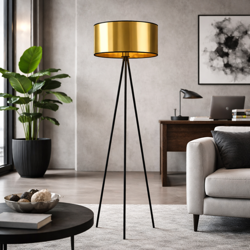 Lampa podłogowa na 3 nogach SEWILLA MIRROR to nowoczesna lampa stojąca loftowa, która łączy industrialny design z eleganckim efektem lustra. Cylindryczny abażur o średnicy 40 cm odbija światło, tworząc ciepły klimat we wnętrzu i podkreślając złoto-miedziane refleksy. Ta lampa podłogowa loft doskonale sprawdzi się jako lampa stojąca do salonu, sypialni lub nowoczesnego gabinetu. Światło żarówki subtelnie przenika przez abażur, tworząc elegancki, wyraźnie zarysowany punkt świetlny, który podkreśla formę lampy i nadaje wnętrzu wyjątkowo szlachetny, nastrojowy charakter.