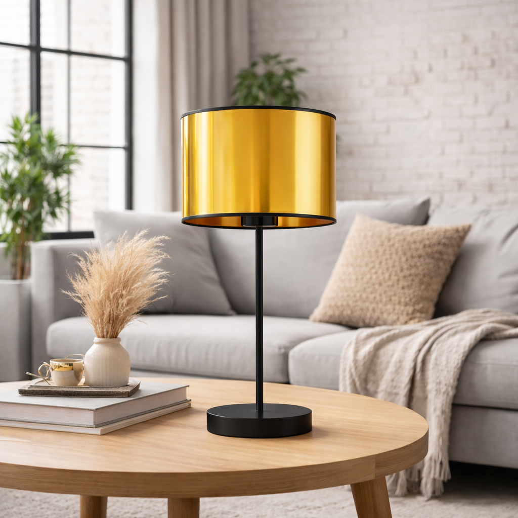 Czarna lampka nocna ze złotym abażurem NICEA MIRROR charakteryzuje się minimalistyczną konstrukcją i ponadczasowym wzornictwem, dzięki czemu idealnie dopasujemy ją do wnętrz urządzonych w różnych stylach aranżacyjnych. Wzrok przykuwa designerki abażur o cylindrycznym kształcie w kolorze złota wykończonego czarną lamówką. Faktura klosza jest półprzeźroczysta i odbija światło przez co oprawa prezentuje się nadzwyczaj prestiżowo i elegancko. Podstawa lampy wykonana jest z metalu malowanego proszkowo na kolor czarny i będzie pasować do większości mebli i dodatków w Twoim mieszkaniu. Smukła podstawa lampy w połączeniu z nowoczesnym kloszem sprawiają, że oprawa sprawdzi się w roli lampki nocnej do czytania w sypialni przy łóżku, minimalistyczna lampa stołowa w salonie doświetlająca subtelnie i delikatnie przestrzeń bądź też w przedpokoju czy holu jako element wskazujący drogę. Ze względu na swoje niewielkie gabaryty (wysokość – 39,5 cm, szerokość – 17,5 cm) lampa stołowa NICEA MIRROR równie dobrze prezentować się będzie na parapecie jako elegancka dekoracja okna bądź też wieczorową porą rozświetli komodę w przedpokoju lub podświetli regał w salonie. NICEA z linii oświetlenia MIRROR oddaje ducha nowoczesnego stylu z elementami złotych dodatków.