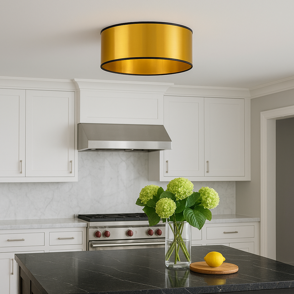 Złoty abażur o średnicy 40 cm wykończony czarną lamówką wygląda rewelacyjne. Lampa sufitowa ze złotym abażurem umieszczona w centralnej części pomieszczenia przykuje wzrok i nada wnętrzu ciepłego i przyjemnego blasku. Faktura materiału PVC z którego został wyprodukowany klosz jest połyskliwa i gładka. Przypomina powierzchnię lustra w której można się przejrzeć. W sposób mistrzowski abażur odbija światło i rozprowadza złoto-żółtą barwę po całym wnętrzu wprowadzając błogi klimat. Plafon DUBAJ MIRROR świetnie współgra się z ozdobnymi żarówkami Edisona, które przenikając przez abażur stają się dodatkową dekoracją.