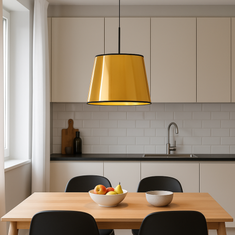 Złota lampa wisząca z abażurem SARI MIRROR to stylowa i funkcjonalna lampa wisząca, która zachwyca ponadczasową formą i nowoczesnym wykończeniem. Jej designerski, złoty abażur został ujęty w odświeżonej, industrialnej odsłonie, co sprawia, że model ten doskonale wpisuje się zarówno w nowoczesne jak i klasyczne wnętrza. SARI MIRROR urzeka subtelną elegancją, a przy tym oferuje praktyczne rozwiązania, które doceni każdy użytkownik. Idealnie sprawdzi się nad stołem w jadalni, wyspą kuchenną, a także jako nastrojowe oświetlenie do salonu czy sypialni.