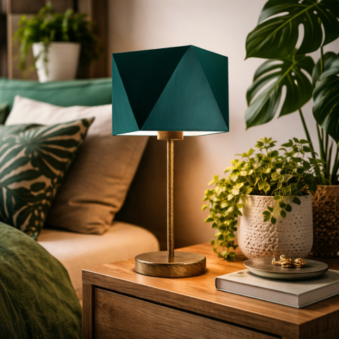 Lampka nocna WUHU od LYSNE.PL — polskiego producenta designerskich lamp z abażurami — wyróżnia się prostą, a jednocześnie bardzo elegancką formą. Składa się ze stabilnego, metalowego stelaża z okrągłą podstawą i klosza z holenderskiej tkaniny tekstylnej, który powstał z inspiracji strukturą diamentu. Materiałowy abażur ma 23-centymetrową przekątną i 16 cm wysokości. Lampka nocna z zielonym abażurem o szerokości 23 cm, w pionie mierzy 43 cm. Dzięki dostępności różnych kolorów klosza (biały, ecru, jasny szary (gołębi), miętowy, musztardowy, jasny różowy, jasny fioletowy, beżowy, szary stalowy, czerwony, niebieski, fioletowy, zieleń butelkowa, granatowy, grafitowy, brązowy, czarny oraz szary melanż (tzw. beton)) oraz sześciu rodzajów powłok stelaża — srebrny, biały, czarny (w standardzie), chrom, stal szczotkowana, stare złoto (wariant dodatkowo płatny), możesz stać się projektantem we własnym domu! Mieszaj kolory i korzystaj z naszych inspiracji! Nowoczesna lampka na stolik nocny z abażurem WUHU jest dostosowana do żarówek z tzw. dużym gwintem (E27) o maksymalnej mocy 60W. Pasują do niej zarówno żarówki LED, jak i źródła światła o klasach energetycznych od A do G. Producent zapewnia 24-miesięczny okres gwarancji na lampkę nocną WUHU.