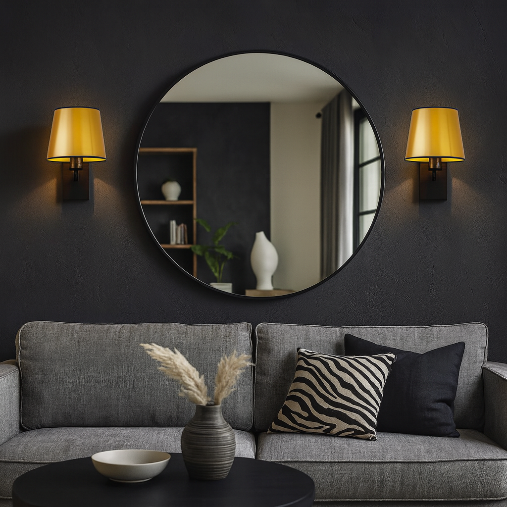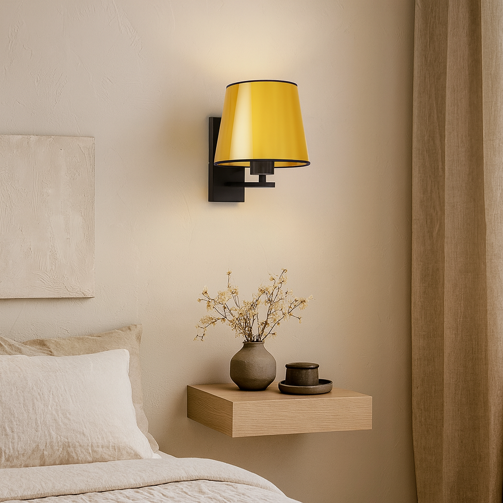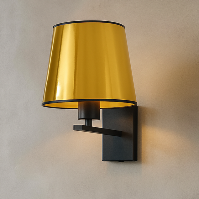 Czarno-złoty kinkiet ścienny HVAR MIRROR wyróżnia się niepowtarzalnym designem, który łączy w sobie elegancję i funkcjonalność. Czarny stelaż o minimalistycznym kształcie harmonijnie współgra z abażurem dostępnym w luksusowym złotym lub miedzianym wykończeniu. Metaliczne powierzchnie abażura subtelnie odbijają światło, nadając pomieszczeniu ciepły i przytulny klimat. Starannie zaprojektowany stelaż w formie prostego ramienia podkreśla nowoczesny charakter kinkietu, który doskonale wpasowuje się zarówno w klasyczne, jak i nowoczesne wnętrza.