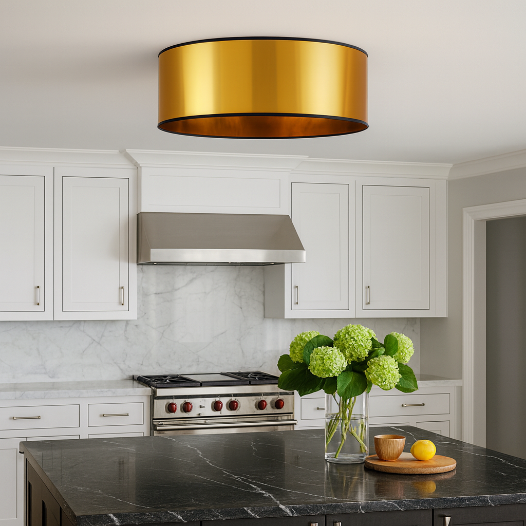 Sercem plafonu DUBAJ MIRROR jest efektowny abażur o średnicy 50 cm w kolorze złotym, wykończony elegancką czarną lamówką. Wykonany z połyskliwego PVC o lustrzanej strukturze nie tylko przyciąga uwagę, ale także doskonale odbija światło, tworząc w pomieszczeniu przyjemny, ciepły klimat. Złotawo-żółta poświata rozchodzi się po wnętrzu, tworząc relaksującą i przytulną atmosferę. To idealny wybór do mieszkań, w których liczy się zarówno design jak i komfort użytkowania. Plafon pięknie komponuje się z dekoracyjnymi żarówkami Edisona, które dodatkowo wzbogacają aranżację światła i nadają całości nieco vintage'owego charakteru.
