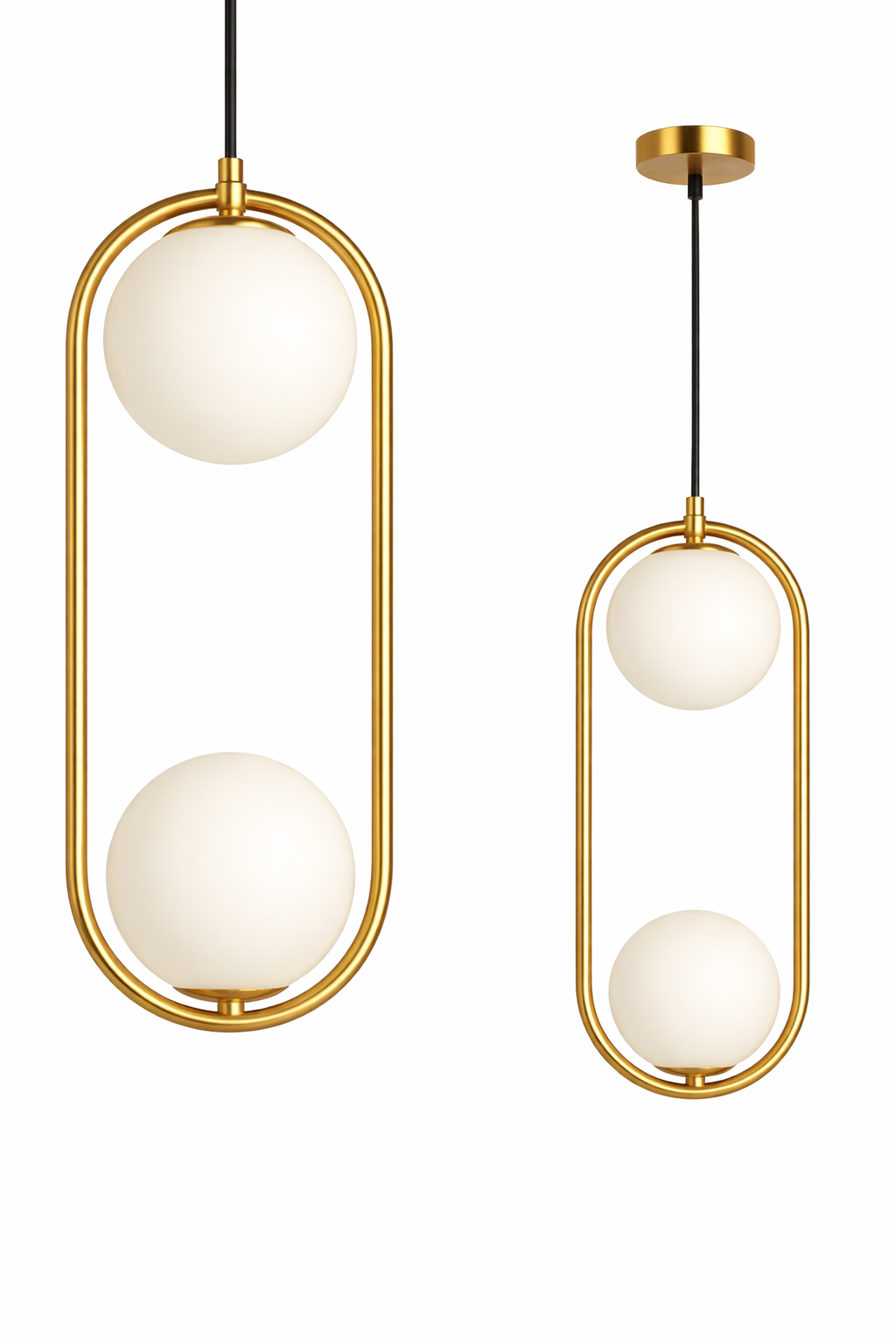 Szklana lampa wisząca MIA to nowoczesna i elegancka propozycja oświetlenia, która doskonale wpisuje się w aktualne trendy wnętrzarskie. Jej minimalistyczna forma w połączeniu z wyrafinowanym designem, sprawia, że stanowi nie tylko funkcjonalne źródło światła, ale również stylowy element dekoracyjny. Model ten został wyposażony w dwa mlecznobiałe, szklane klosze o kulistym kształcie, które subtelnie rozpraszają światło, tworząc przytulną i nastrojową atmosferę w pomieszczeniu. Całość oprawiona jest w delikatną, złotą ramę o owalnym kształcie, która dodaje lampie lekkości oraz klasycznego uroku z nutą art déco.
