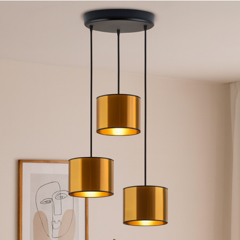 Nowoczesna lampa wisząca z 3 źródłami światła PUEBLO MIRROR to propozycja, która zachwyci miłośników nowoczesnych wnętrz i ponadczasowej elegancji. Ta czarno-miedziana lampa wisząca w stylu glamour łączy funkcjonalność z dekoracyjnym charakterem wprowadzając do wnętrza wyjątkowy klimat. Jej konstrukcja opiera się na trzech punktach świetlnych, które zwisają z rozety sufitowej na różnej wysokości, tworząc efekt lekkiej, przestrzennej kompozycji. Klosze w kształcie walca wykonane zostały z wysokogatunkowego materiału PVC o lustrzanym wykończeniu, które pięknie odbija światło i dodaje aranżacji blasku. Miedziane abażury otulone czarną lamówką idealnie współgrają z czarnym stelażem, tworząc spójną, elegancką całość.